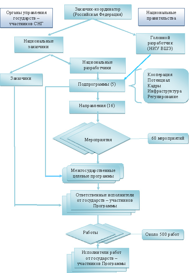 финансирование мероприятий и инновационных проектов, реализуемых в рамках МЦП, которым решением Совета глав правительств СНГ придан статус структурного элемента Программы, осуществляется в соответствии с Порядком разработки, реализации и финансирования МЦП СНГ, утвержденным Решением Совета глав правительств СНГ от 16 апреля 2004 года. Финансирование мероприятий и инновационных проектов, не включенных в МЦП, которым решениями Совета глав правительств СНГ придан статус «проектов Программы», осуществляется за счет средств, поступающих из внебюджетных источников, и средств национальных бюджетов государств – участников СНГ в рамках национальных программ и/или в пределах средств, предусматриваемых министерствам и ведомствам на осуществление ими своих функций. Объемы и источники финансирования мероприятий, инновационных и инвестиционных проектов определяются в каждом конкретном случае в решениях Совета глав правительств СНГ об их разработке и реализации |