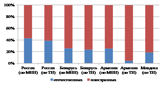 5. В Содружестве укрепляются позиции иностранных фармацевтических компаний на фоне продолжающегося спада локального производства. Здесь действует небольшое количество собственных фармацевтических производств, что делает государства – участники СНГ в высокой степени зависимыми от импорта. Хотя в натуральном выражении отдельные препараты локального производства занимают около половины рынка, в стоимостном измерении преобладают лекарственные средства иностранного производства. Отечественные производители лекарственных препаратов проигрывают в рыночной конкуренции не только крупнейшим мировым фармацевтическим корпорациям, разрабатывающим новейшие инновационные препараты, но и производителям воспроизведенных лекарственных препаратов и фармацевтических субстанций Китая и Индии. Вместе с тем наблюдается тенденция локализации иностранными фармацевтическими корпорациями конечных стадий производства своих препаратов, создания совместных предприятий для повышения доступа к государственным закупкам и использования преференций национальных производителей.