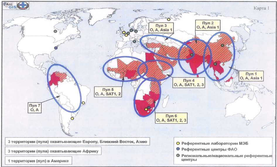 Согласно классификации ФАО и МЭБ, созданной на основе генетического родства циркулирующих штаммов вируса ящура, неблагополучные территории мира разделены на 7 региональных пулов (зон), которые включают страны Восточной Азии (пул 1), Южной Азии (пул 2), Ближнего Востока и Средней Азии (пул 3), Африки (пулы 4–6), Южной Америки (пул 7) (приложение, карта 1). В целом количество случаев проявления заболевания в мире не имеет тенденции к снижению (от 50 до 70 неблагополучных стран ежегодно за последнее десятилетие).