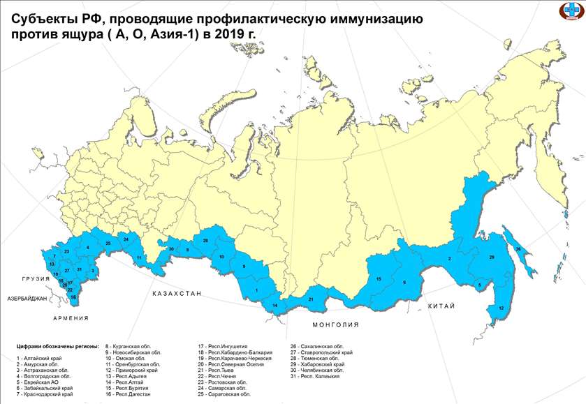 Так, в 2018–2019 годах среди КРС и МРС было зарегистрировано в Афганистане 274 очага ящура, в Иране – 1876 очагов типов О, А, Азия-1, в Индии – 227 очагов типа О, Пакистане – 1668 очагов типов А, О, Азия-1, в Египте – 119 очагов типов О, А, SAT-2, в Турции – 435 очагов. В Китае в 2018–2019 годах среди КРС, МРС и свиней были установлены 32 вспышки ящура типов О и А. В Монголии среди КРС, МРС и верблюдов в 2018–2019 годах было выявлено 25 очагов ящура типа О.