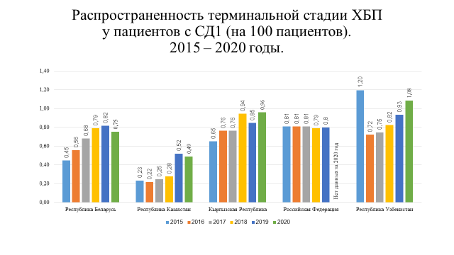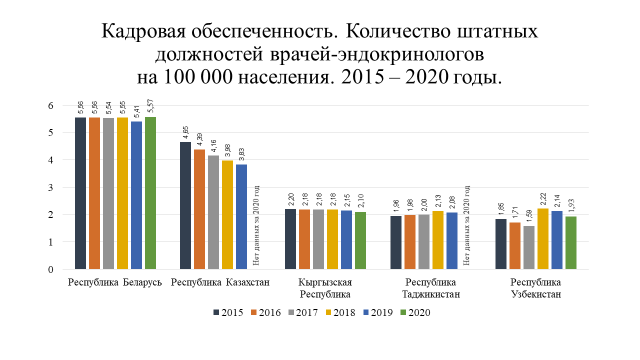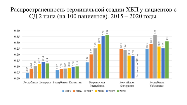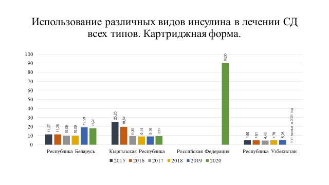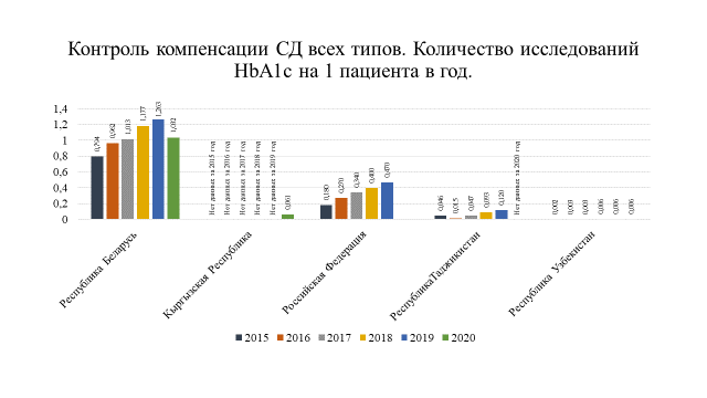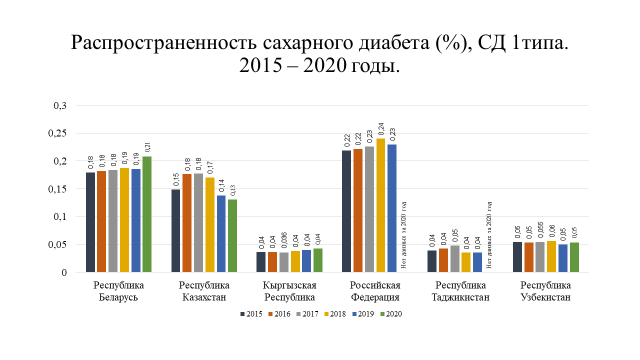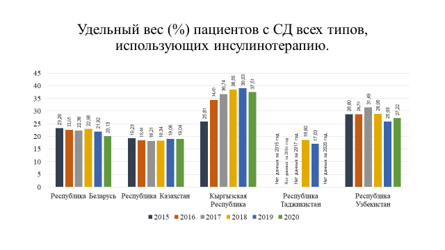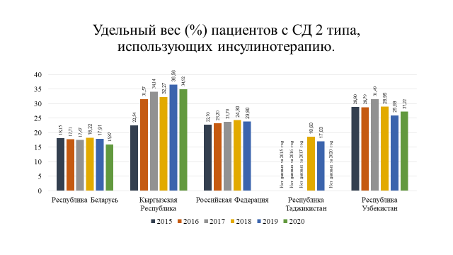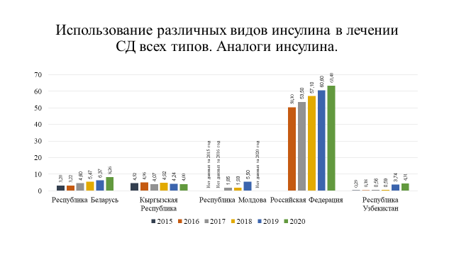 Анализ статистических показателей по СД как индикатора организации диабетологической помощи выявил тенденцию к росту распространенности сахарного диабета во всех государствах – участниках СНГ. Это обусловлено увеличением числа пациентов с СД 2 типа, однако в некоторых странах их число составляет менее 1 % населения, что может свидетельствовать о недостаточной работе по ранней диагностике заболевания. Отмечено, что в среднем около 20 % пациентов с СД используют в лечении инсулинотерапию, отмечается постепенный рост использования аналогов инсулина.