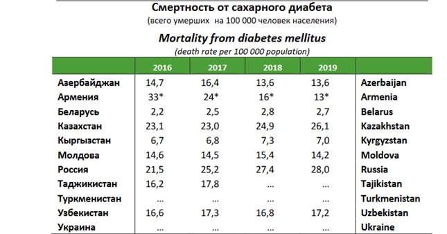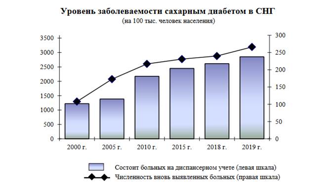 На начало 2020 года в странах СНГ состояло на учете с диагнозом «сахарный диабет» 2853 больных на 100 тысяч человек населения, что на 12 % больше, чем на начало 2019 года; из них более половины составляют женщины.