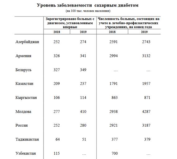 В 2019 году в странах Содружества было зарегистрировано 548 тысяч человек с новыми случаями заболевания сахарным диабетом (в 2018 году – 535 тысяч заболевших). В Азербайджане, Армении, Беларуси, Казахстане, Молдове и России число новых случаев заболевания сахарным диабетом составило 237-349 человек на 100 тысяч человек населения; в Кыргызстане –114 и Таджикистане – 51.