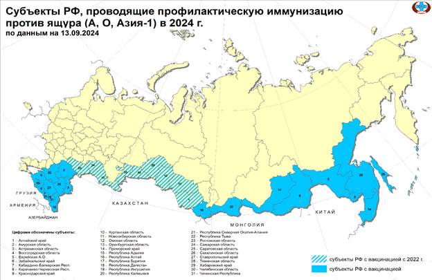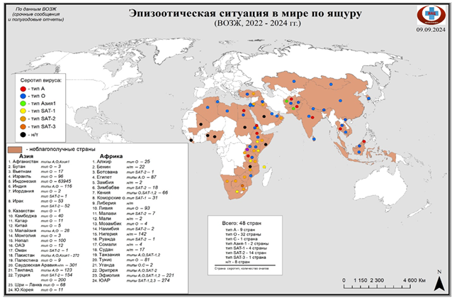 В 2020–2024 годах ящур официально нотифицирован в ВОЗЖ только в Республике Казахстан и Российской Федерации.
