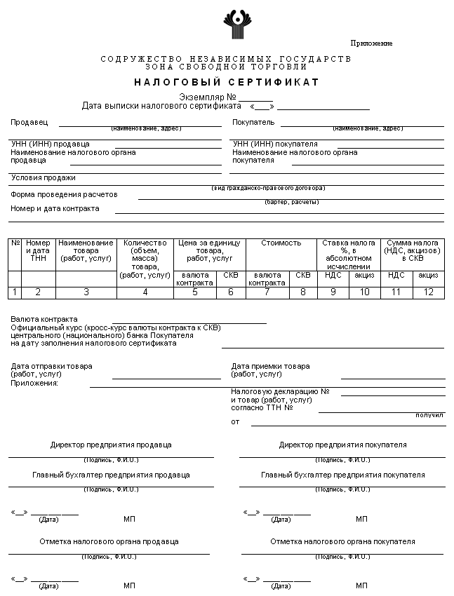 б) налоговый сертификат, заполненный по единой форме, согласованной государствами-участниками Соглашения (приложение).
