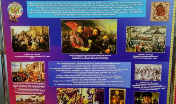 День народного единства установлен в память о событиях 1612 года, когда народное ополчение под предводительством Кузьмы Минина и Дмитрия Пожарского освободило Москву от польских интервентов. Исторически этот праздник связан с окончанием Смутного времени в России в XVII веке. Смутное время – период со смерти в 1584 году царя Ивана Грозного и до 1613 года, когда на русском престоле воцарился первый из династии Романовых, эпоха глубокого кризиса Московского государства, вызванного пресечением царской династии Рюриковичей.