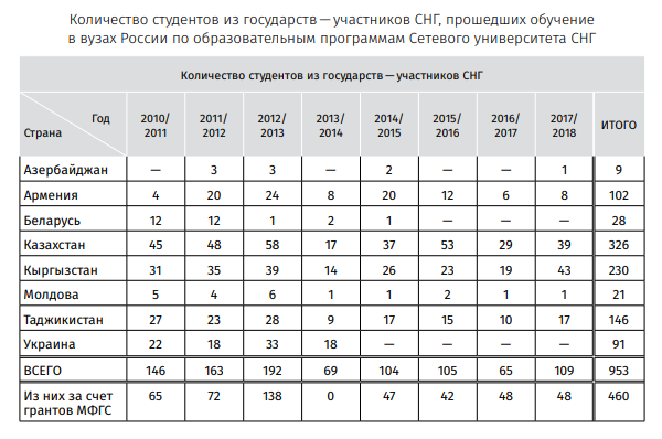 С момента создания Сетевого университета СНГ по совместным образовательным программам с получением двух дипломов только в Российской Федерации в рамках Консорциума прошло обучение более 950 иностранных граждан (табл.).