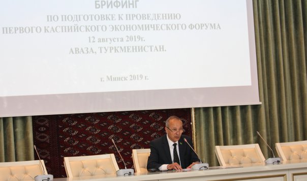 Брифинг был посвящен подготовке Туркменистана к проведению Первого Каспийского экономического форума, который состоится 12 августа 2019 года в Национальной туристической зоне «Аваза».