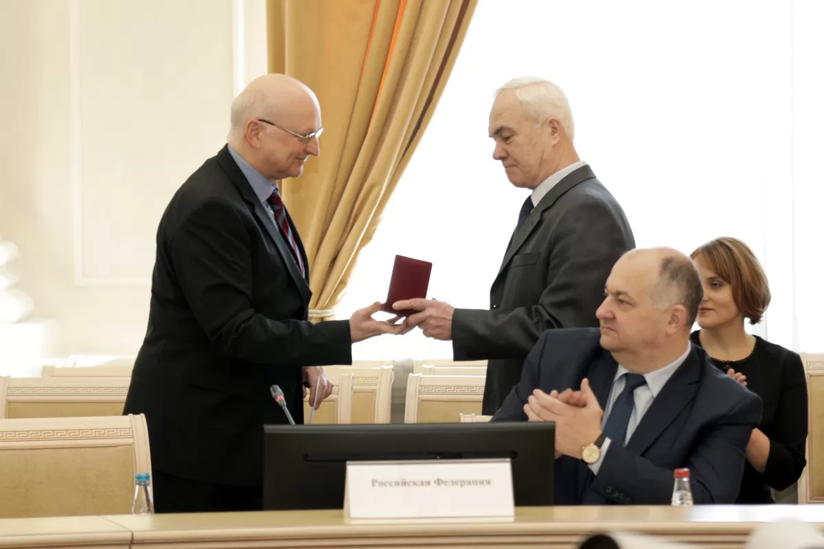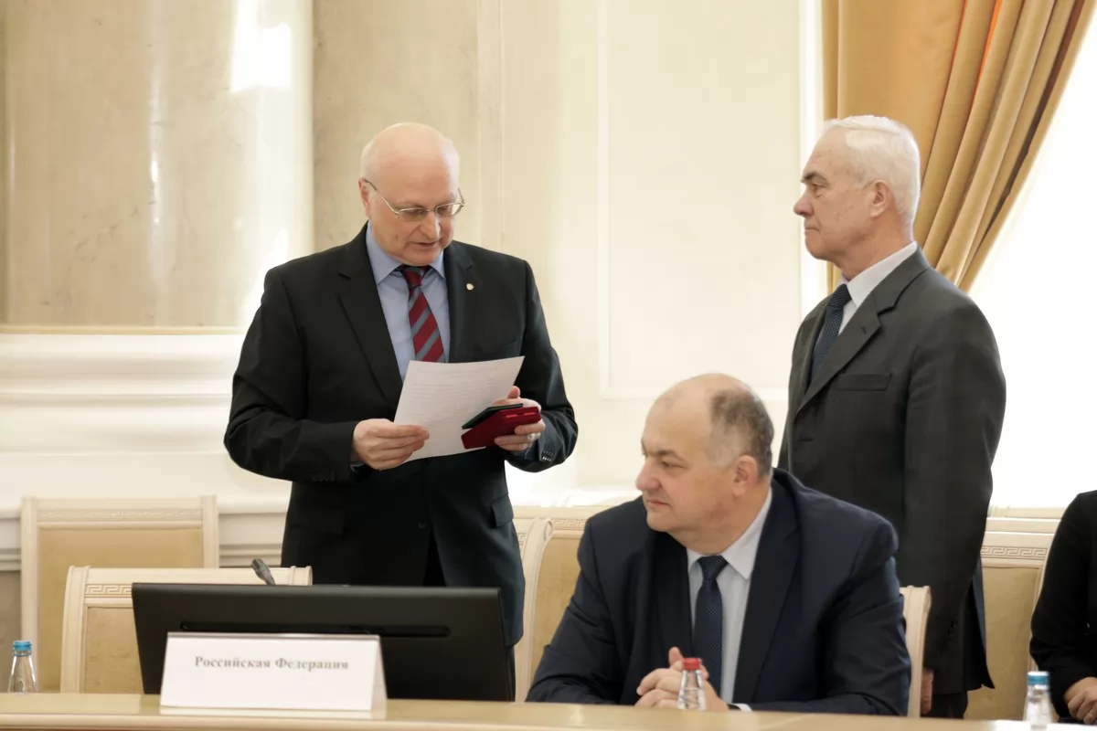 Перед началом заседания Постоянный представитель России при уставных и других органах Содружества Андрей Грозов вручил директору департамента по сотрудничеству в сфере безопасности и противодействия новым вызовам и угрозам Исполкома СНГ Альберту Дружинину нагрудный знак «За взаимодействие» Министерства иностранных дел Российской Федерации за содействие в укреплении мира и дружественных отношений между государствами – участниками СНГ.