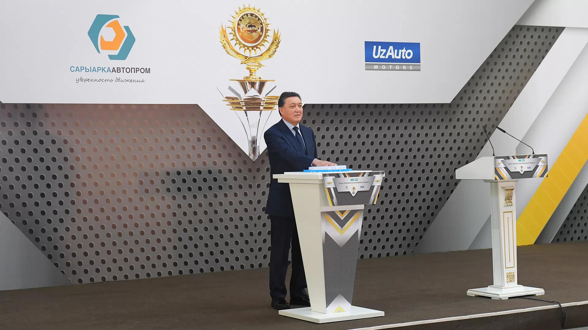 Премьер-Министр Республики Казахстан Аскар Мамин в ходе рабочей поездки в г. Костанай принял участие в церемонии открытия совместной казахстанско-узбекистанской автосборочной линии новых моделей марки «Chevrolet» на Костанайском автомобильном заводе.