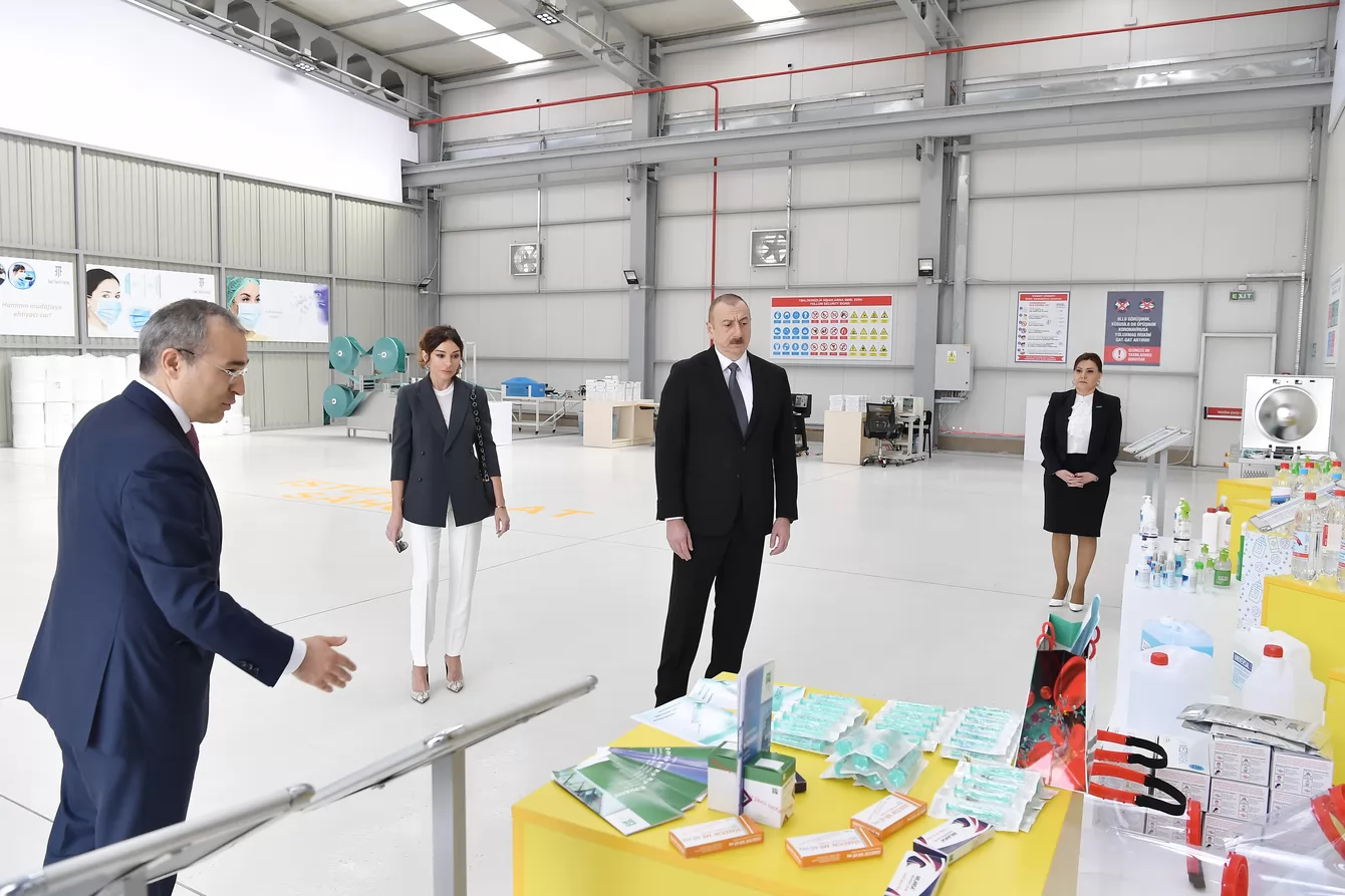 6 апреля Президент Азербайджанской Республики Ильхам Алиев и первая леди Мехрибан Алиева приняли участие в открытии предприятия по производству медицинских масок, созданного ООО «Бакинская текстильная фабрика» в Сумгайытском химическом промышленном парке.