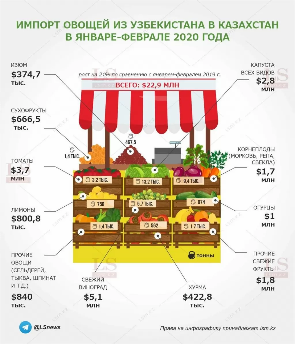 Объем импорта свежих овощей и фруктов из Узбекистана за два месяца 2020 года составил $22,9 млн, что на 21,2% больше, чем в аналогичном периоде 2019 года. Из общего уровня поставок сельхозпродукции со всех стран мира в Казахстан, наша республика занимает долю более чем в 20%.