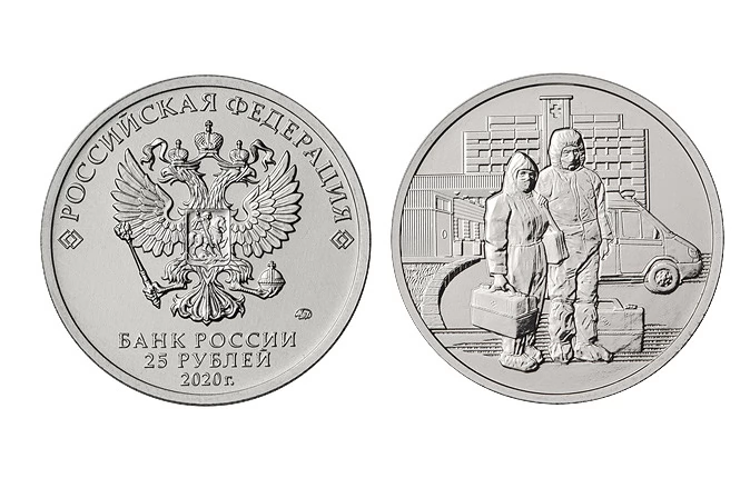 ЦБ РФ также выпускает монету серии "Памятная монета, посвященная самоотверженному труду медицинских работников". На оборотной стороне монеты изображены два медицинских работника - женщина и мужчина - в защитных костюмах с реанимационными чемоданами на фоне здания медицинского учреждения и кареты скорой помощи. Монета будет выпущена тиражом в 5 млн штук, а ее номинал составит 25 руб.