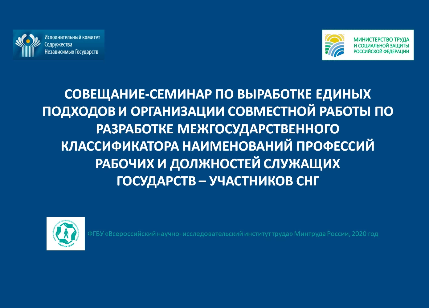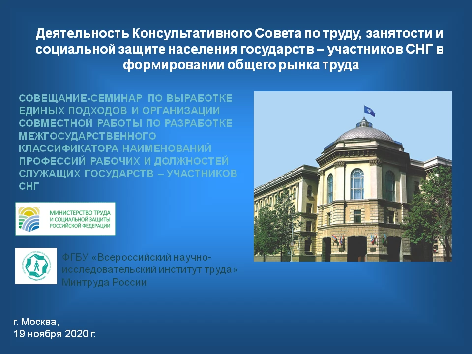 19 ноября 2020 года в режиме видеоконференцсвязи состоялось заседание рабочей группы по выработке единых подходов и организации совместной деятельности по разработке межгосударственного классификатора наименований профессий рабочих и должностей служащих государств – участников СНГ.