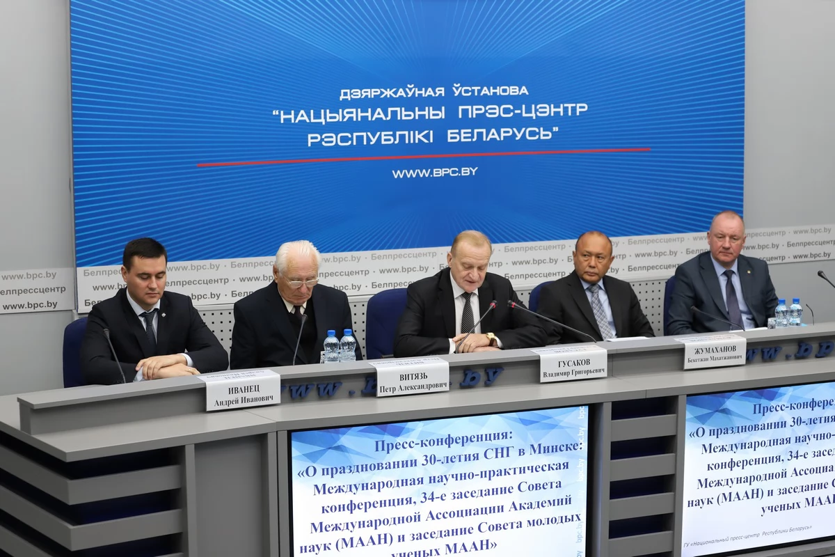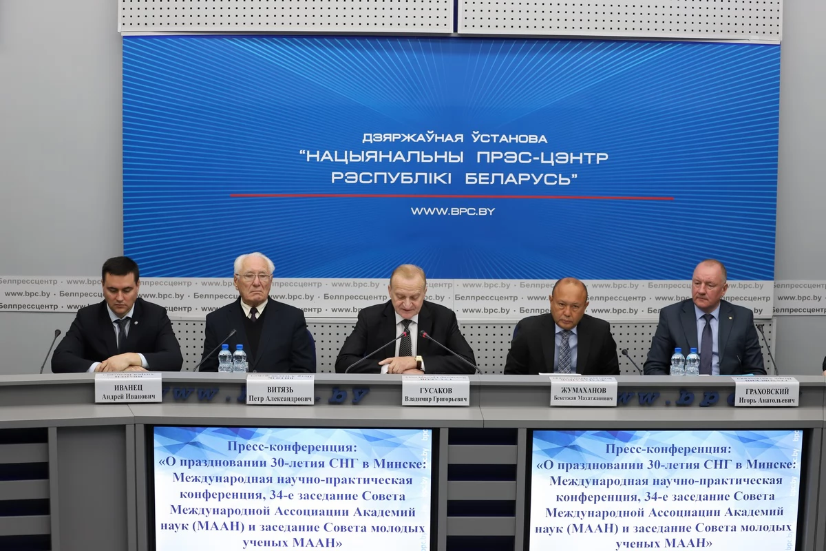 Международная научно-практическая конференция «30 лет Содружеству Независимых Государств: итоги, перспективы» пройдет 27-29 сентября в Минске. Ее проведение анонсировали на пресс-конференции, которая сегодня прошла в Национальном пресс-центре Республики Беларусь. От Исполнительного комитета СНГ участие в ней приняли заместитель Председателя Бекетжан Жумаханов и директор организационного департамента Игорь Граховский, от Национальной Академии наук Беларуси – Председатель Президиума Владимир Гусаков, руководитель аппарата Петр Витязь и главный ученый секретарь Андрей Иванец.