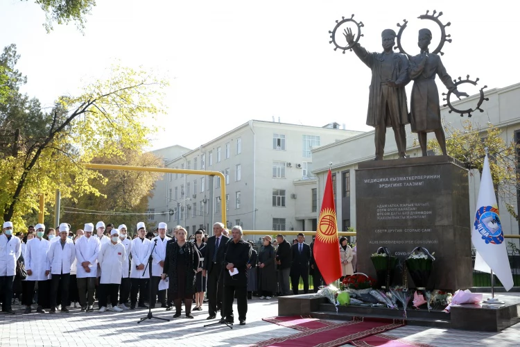 Участники мероприятия, близкие, родственники и коллеги погибших врачей и медицинского персонала возложили к памятнику цветы и почтили память скончавшихся минутой молчания. После этого прозвучал гимн Кыргызской Республики.