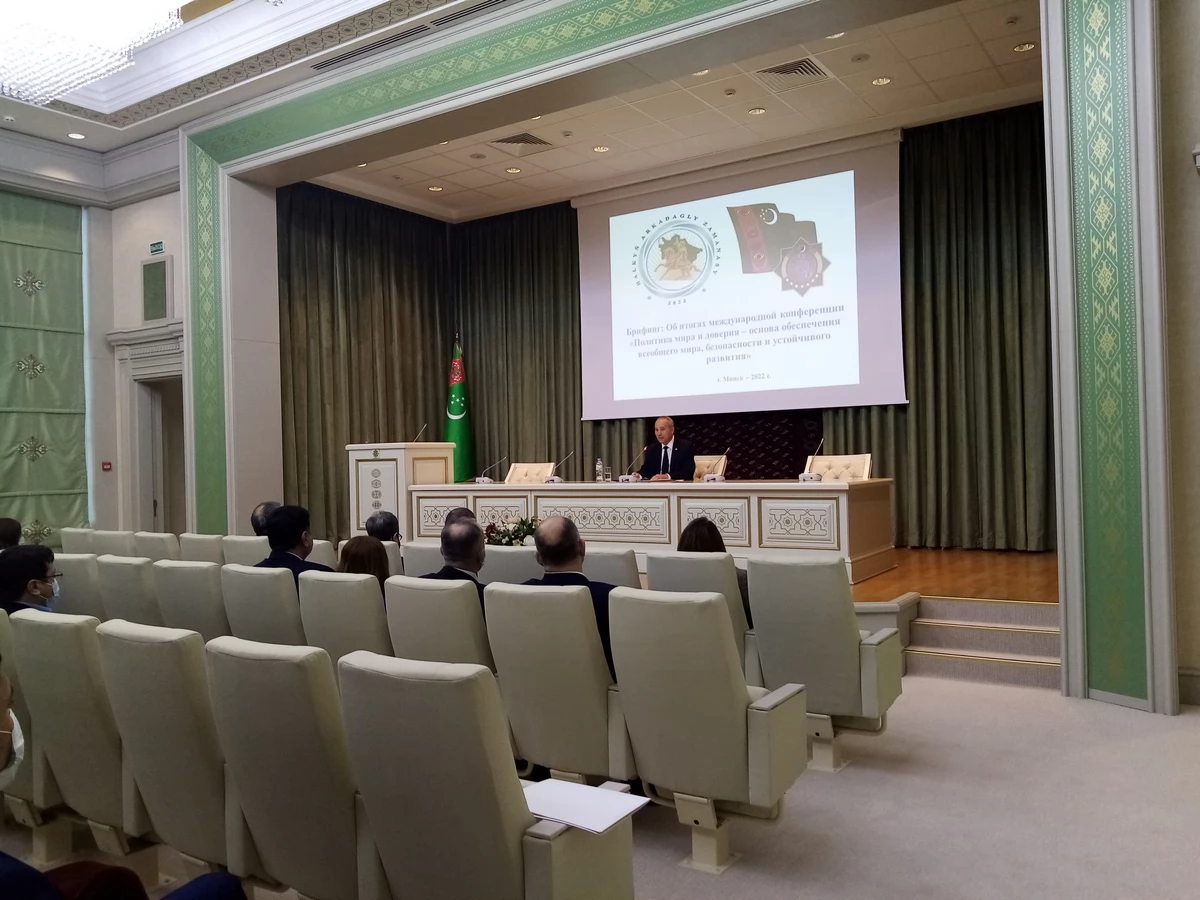 27 января в Посольстве Туркменистана в Республике Беларусь прошел брифинг, посвященный итогам конференции «Политика мира и доверия – основа обеспечения всеобщего мира, безопасности и устойчивого развития». В мероприятии приняли участие постоянные полномочные представители государств – участников Содружества при уставных и других органах Содружества, сотрудники дипломатических миссий, аккредитованных в Беларуси, представители Исполнительного комитета СНГ.