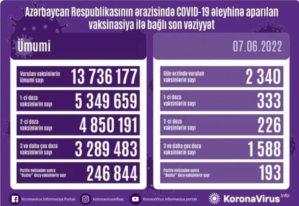 Общее число доз вакцин, введенных на сегодняшний день в Азербайджане, составляет 13 миллионов 736 тысяч 177, общее число доз вакцин, введенных на первом этапе вакцинации - 5 миллионов 349 тысяч 659, на втором этапе – 4 миллиона 850 тысяч 191, на третьем и следующем этапах вакцинации – 3 миллиона 289 тысяч 483, количество бустерных доз после положительного результата – 246 тысяч 844.
