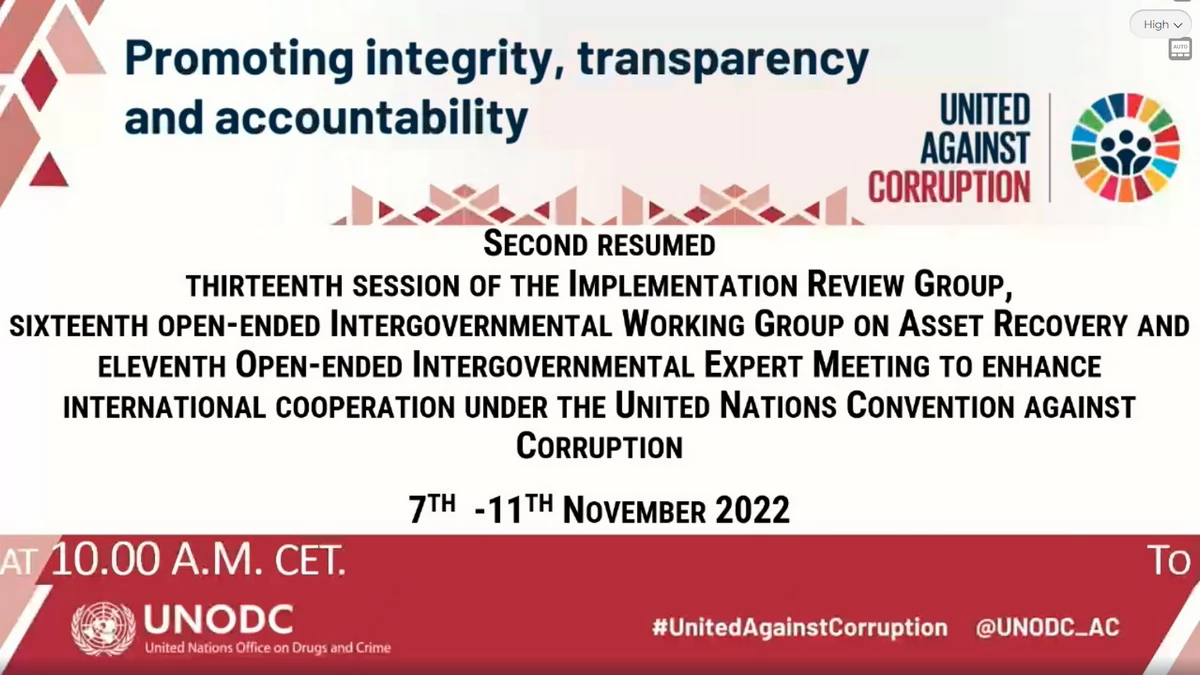 C 7 по 11 ноября 2022 года в смешанном формате состоялись вторая часть возобновленной тринадцатой сессии Группы по обзору хода осуществления Конвенции ООН против коррупции, шестнадцатая сессия Межправительственной рабочей группы открытого состава по возвращению активов и одиннадцатое Межправительственное совещание экспертов открытого состава по развитию международного сотрудничества в рамках Конвенции ООН против коррупции.