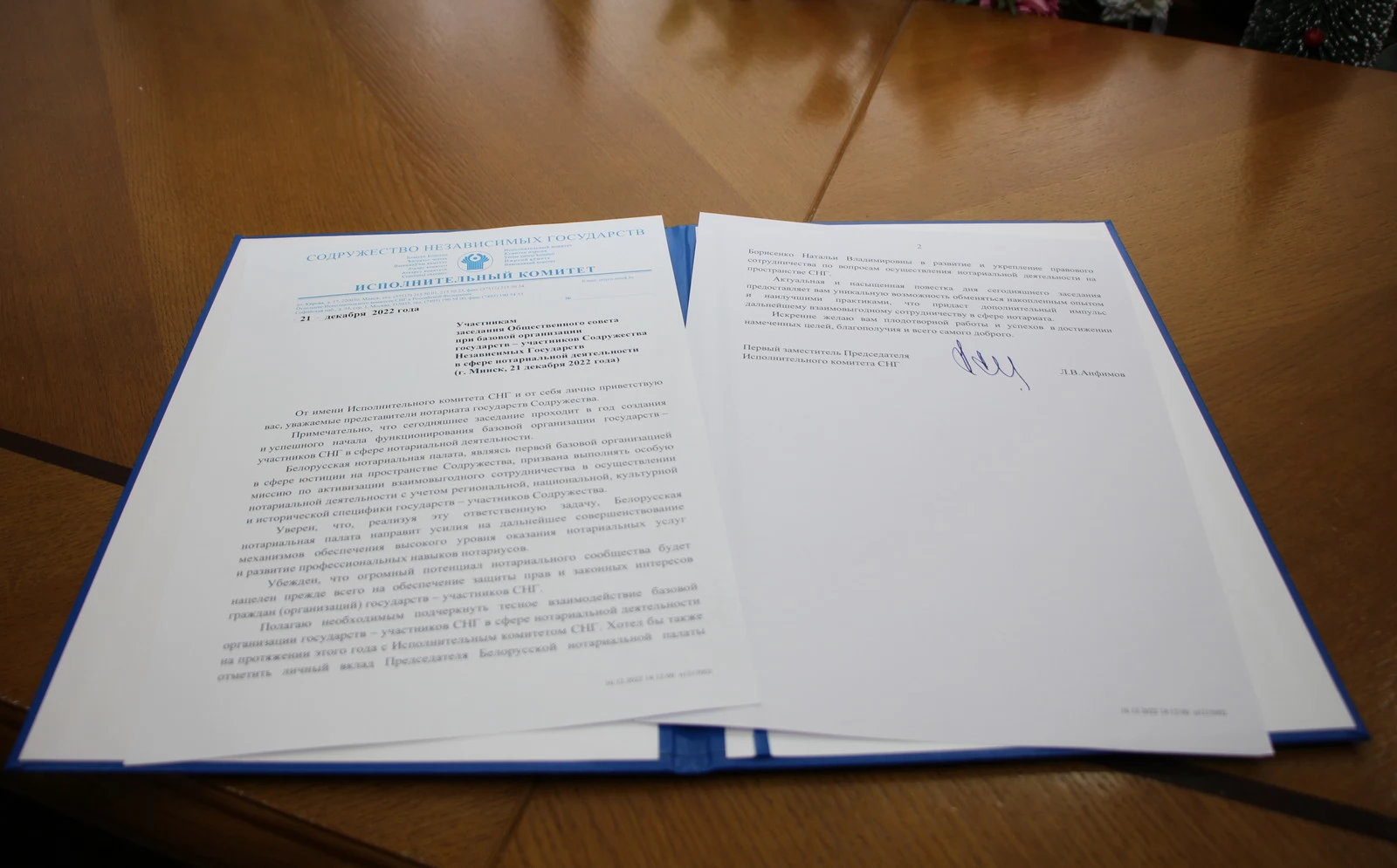 Как отметил первый заместитель председателя Исполнительного комитета СНГ Леонид Анфимов, Белорусская нотариальная палата, будучи первой базовой организацией в сфере юстиции на пространстве Содружества, призвана выполнять особую миссию по активизации взаимовыгодного сотрудничества в осуществлении нотариальной деятельности с учетом региональной, национальной, культурной и исторической специфики государств - участников Содружества.
