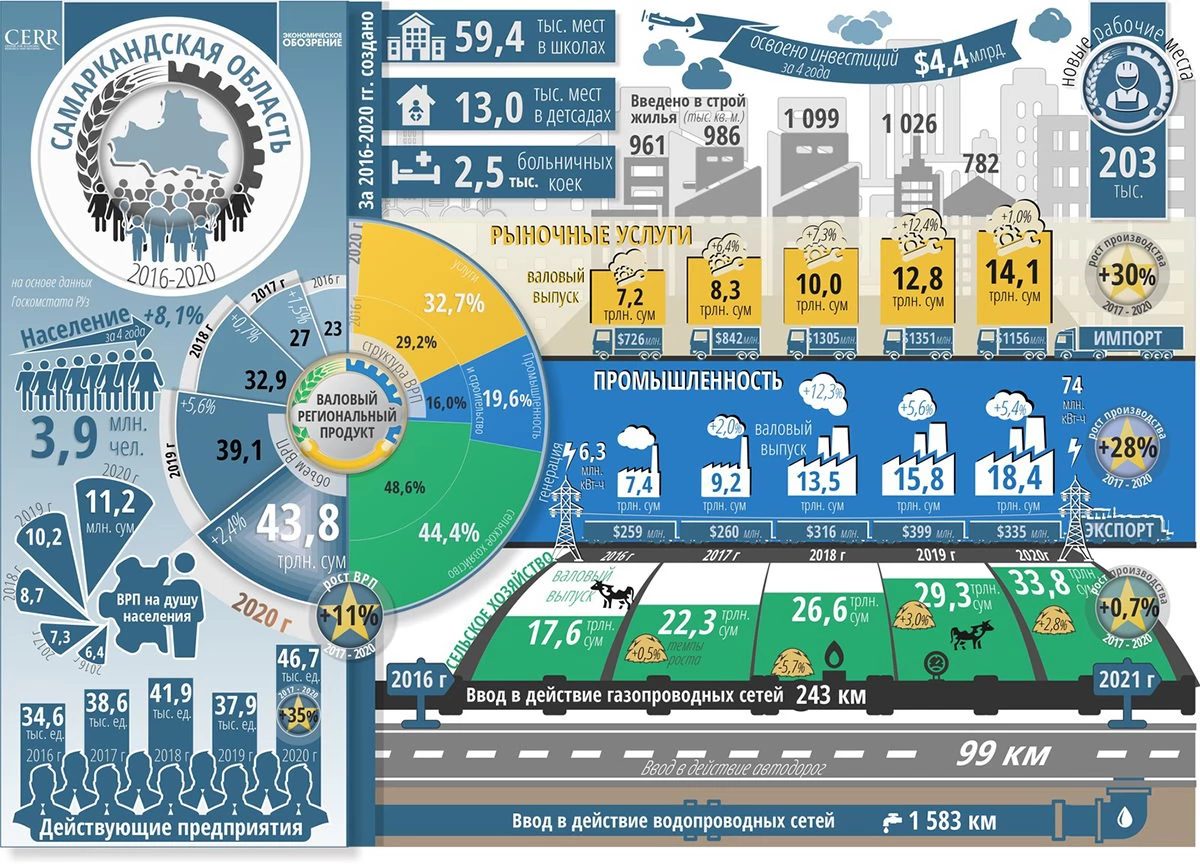 В последние годы Самарканд все больше превращается в мегаполис, международный центр форумов, туризма и коммерции. Темпы промышленного роста находят свое отражение в облике города. За последние несколько лет здесь выросли многоэтажные жилые массивы, проложены трамвайные ветки, открыты десятки торговых центров, построен международный аэропорт, принимающий свыше 120 рейсов в неделю.