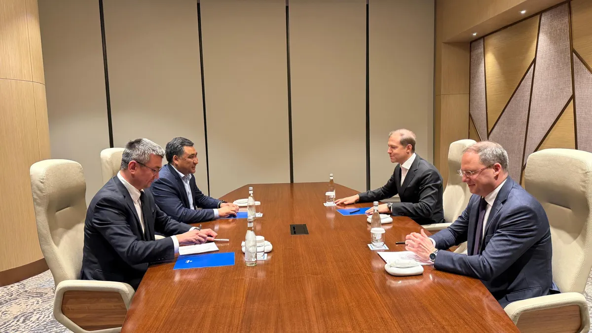 Первый заместитель Председателя Кабинета Министров Кыргызской Республики Данияр Амангельдиев в рамках рабочей поездки в Республику Узбекистан на полях Международной промышленной выставки «ИННОПРОМ. Центральная Азия» встретился с Первым заместителем Председателя Правительства Российской Федерации Денисом Мантуровым.