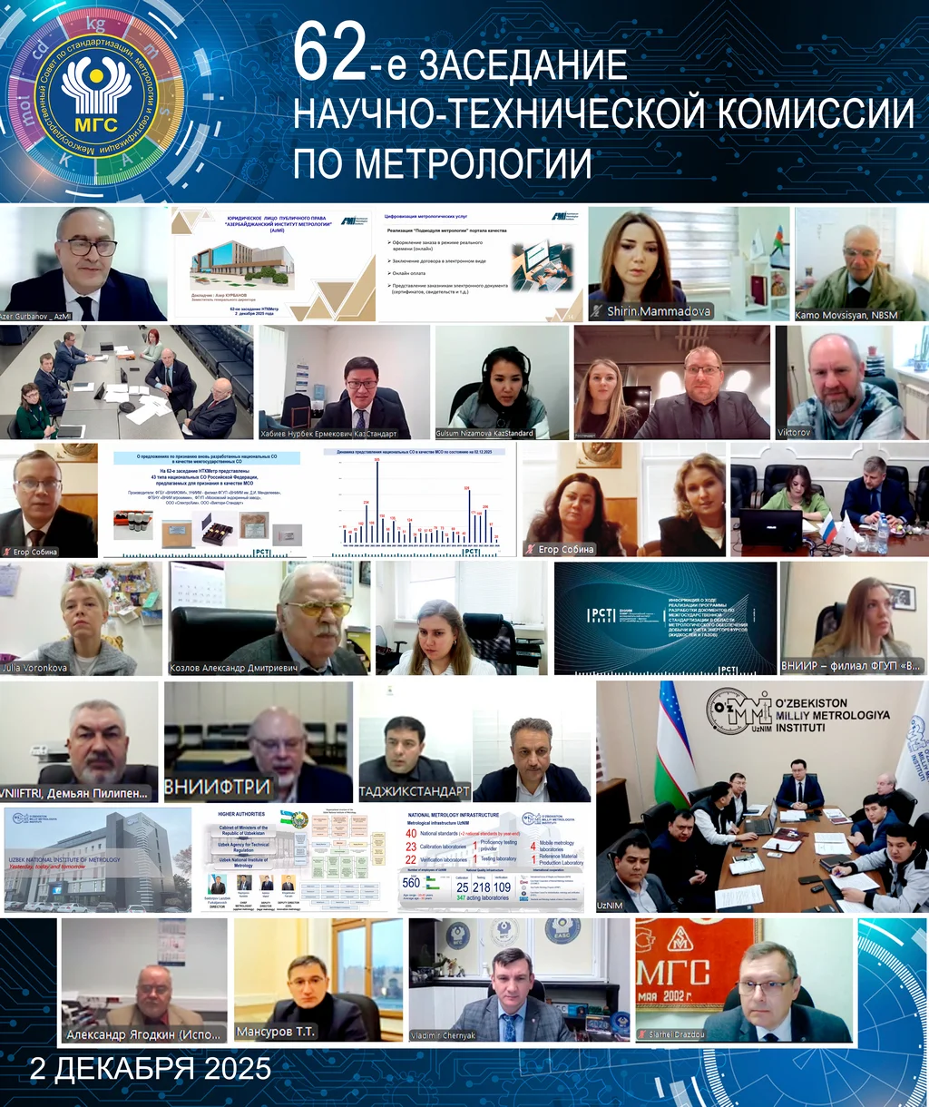 В работе заседания 2 декабря 2025 года приняли участие специалисты национальных органов по метрологии и аккредитации государств – участников Соглашения Азербайджанской Республики, Республики Армения, Республики Беларусь, Республики Казахстан, Российской Федерации, Республики Таджикистан, Республики Узбекистан, а также Исполнительного комитета СНГ и Бюро по стандартам.