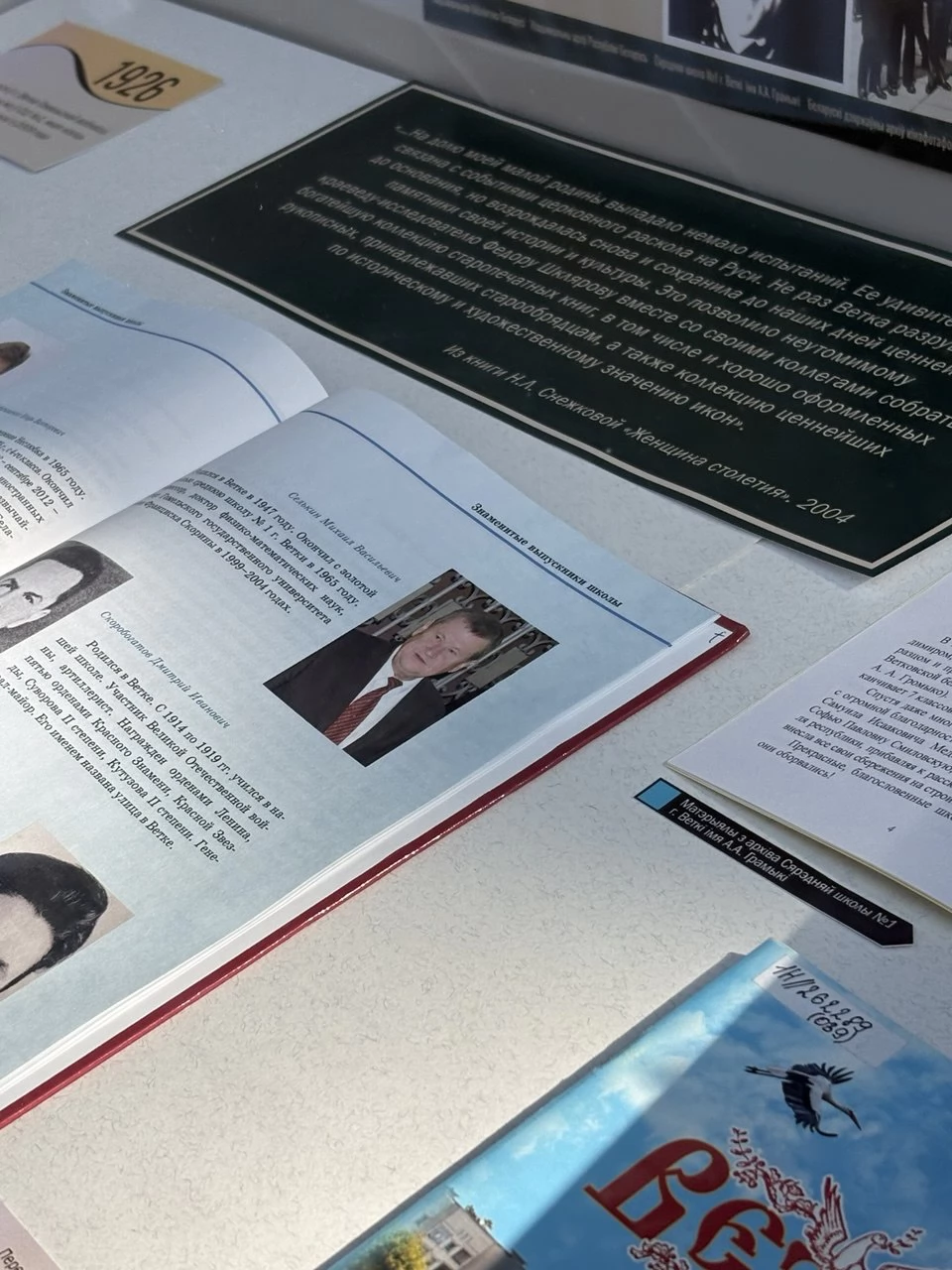 Среди экспонатов выставки – малоизвестные биографические материалы, уникальные фотографии, поздравительная телеграмма Главы государства от 25 апреля 2001 г., переписка с известными белорусами из школьного музея средней школы № 1 города Ветки имени А.А.Громыко, копии архивных документов из Национального архива Республики Беларусь, статьи и публикации из фонда Национальной библиотеки Беларуси.