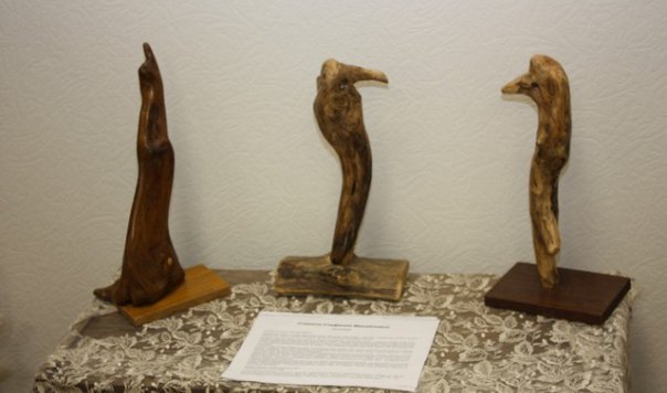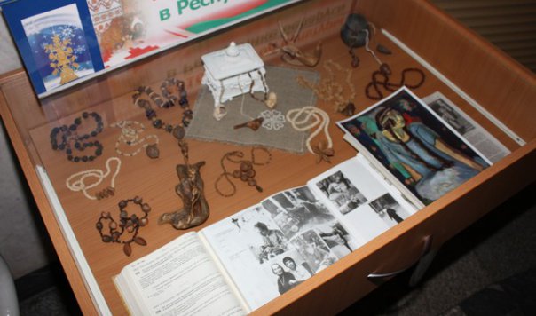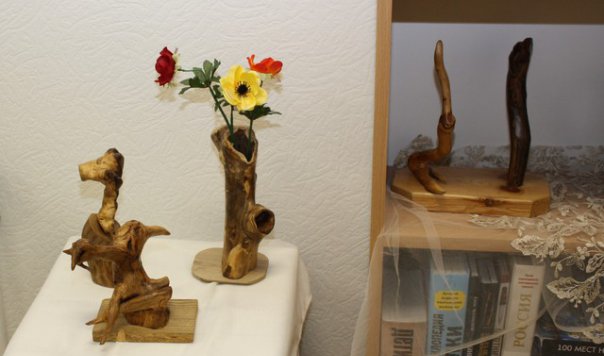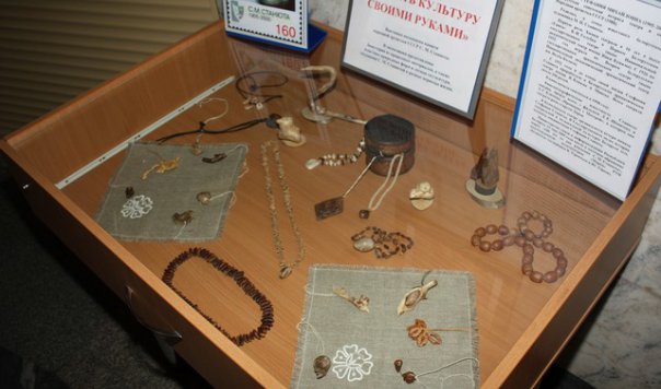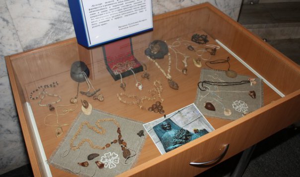 В экспозиции представлены бижутерия из природных материалов (бусы, колье, кулоны, подвески), а также пластика природных форм и лесная скульптура, созданные С.М. Станютой в разные периоды жизни и бережно сохраняемые минским клубом «Природа и фантазия».