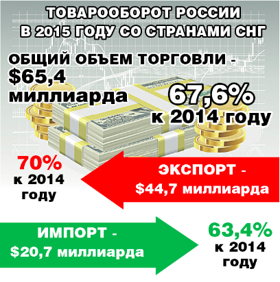 В целом доля стран Содружества в товарообороте России в 2015 году возросла с 12,3 до 12,5 процента. Это 65,5 миллиарда долларов. В значительной степени из-за изменения курса рубля стоимостные показатели товарооборота, по данным ФТС России, уменьшились на 32 процента. Возросла доля в общем товарообороте Беларуси, Казахстана, Кыргызстана и Таджикистана.
