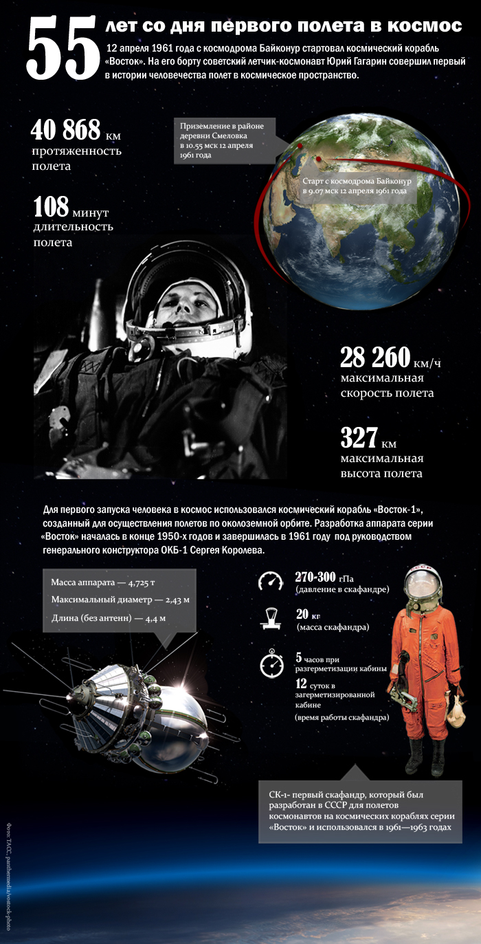 55 лет назад, 12 апреля 1961 года, советский летчик – испытатель Юрий Гагарин совершил первый в истории человечества космический полет, который длился 108 минут и стал огромным шагом для всего человечества в деле освоения космического пространства.