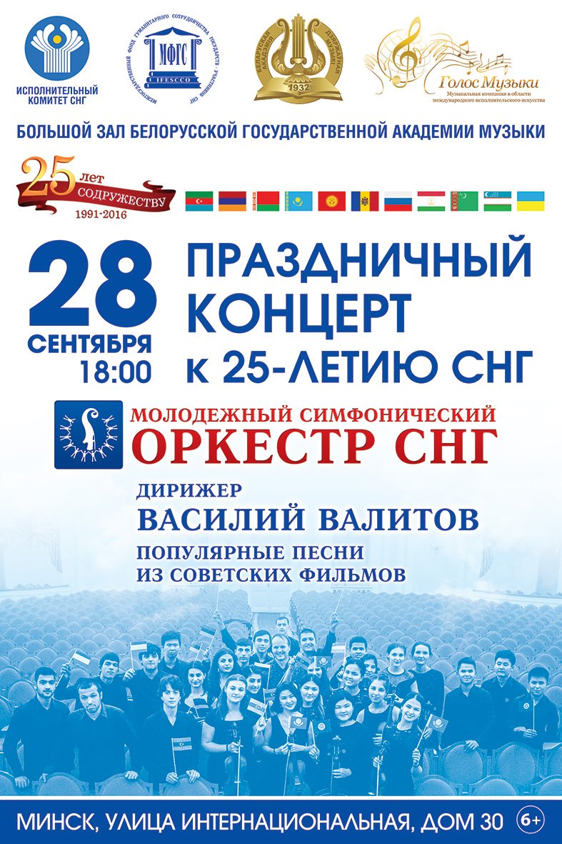 28 сентября 2016 года в Белорусской государственной академии музыки (ул. Интернациональная, 30) состоится концерт Молодежного симфонического оркестра СНГ, посвященный 25-летию Содружества Независимых Государств.