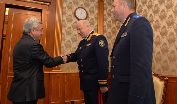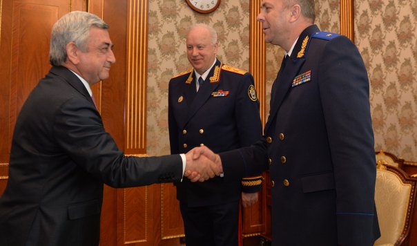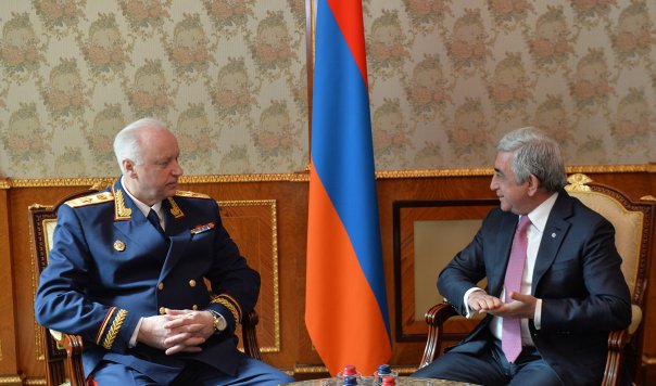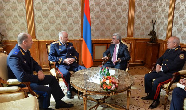 Президент Армении Серж Саргсян 18 октября принял находящихся с рабочим визитом в Армении председателя Следственного комитета Российской Федерации Александря Бастрыкина и председателя Следственного комитета Республики Беларусь Ивана Носкевича, которые прибыли в Ереван для участия в заседании совместной коллегии следственных комитетов Армении, России и Беларуси.