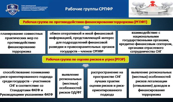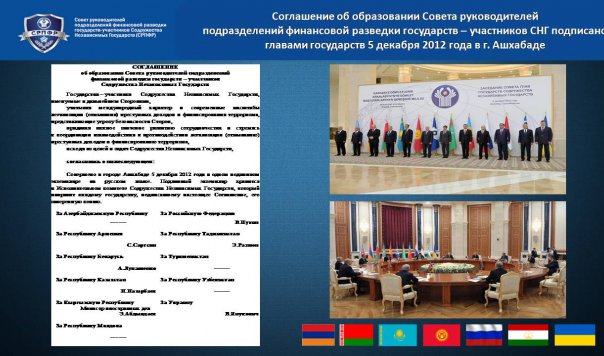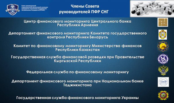 В целях координации и понимая важности взаимодействия государств – участников Содружества Независимых Государств в рамках сотрудничества служб, занятых в области противодействия легализации (отмыванию) преступных доходов и финансированию терроризма на пространстве Содружества Независимых Государств, и на основании Соглашения, подписанного главами Республики Армения, Республики Беларусь, Республики Казахстан, Кыргызской Республики, Российской Федерации, Республики Таджикистан и Украины 5 декабря 2012 года, создан Совет руководителей подразделений финансовой разведки государств – участников Содружества Независимых Государств (далее – СРПФР, Совет).