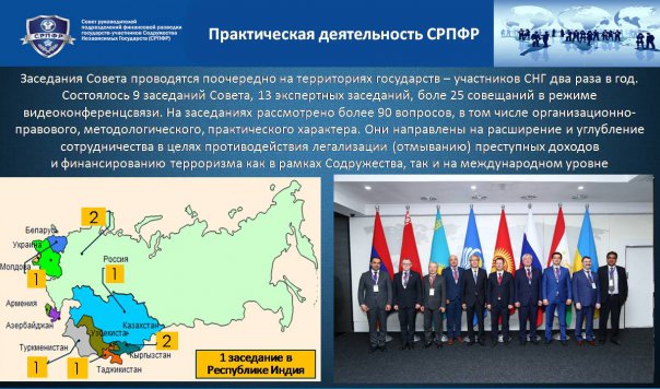 В рамках исполнения межгосударственных программ сотрудничества государств – участников Содружества СРПФР во взаимодействии с другими заинтересованными компетентными органами, органами отраслевого сотрудничества СНГ, а также международными организациями на регулярной основе принимал участие в совместных межведомственных профилактических, специальных операциях, в работе научно-практических конференций, круглых столов, семинарах и иных мероприятиях, направленных на противодействие различным видам преступности, борьбу с терроризмом и иными насильственными проявлениями экстремизма, противодействие незаконному обороту наркотических средств, психотропных веществ и их прекурсоров, в том числе пресечение финансовых потоков и каналов поставки наркотиков, борьбу с преступлениями, совершаемыми с использованием информационных технологий, противодействие незаконной миграции.
