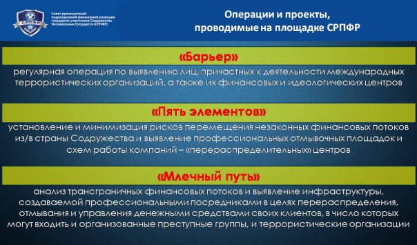 проекта «Пять элементов», направленного на установление и минимизацию рисков перемещения незаконных финансовых потоков из/в страны Содружества и выявление профессиональных «отмывочных площадок» и схем работы компаний – «перераспределительных» центров, обеспечивающих разрыв связи между реальными контрагентами (источником происхождения и пунктом конечного инвестирования денежных средств).