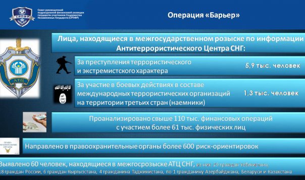 Разработанная методология («Барьер») показала свою эффективность по организации финансового мониторинг-контроля за операциями, совершенными: в зонах с повышенной террористической активностью и приграничных к территориям боевых действий; лицами, находящимися в межгосударственном розыске СНГ за преступления террористического и экстремистского характера; с использованием бланков документов, удостоверяющих личность граждан Сирии и Ирака, попавших в распоряжение боевиков МТО «ИГИЛ».