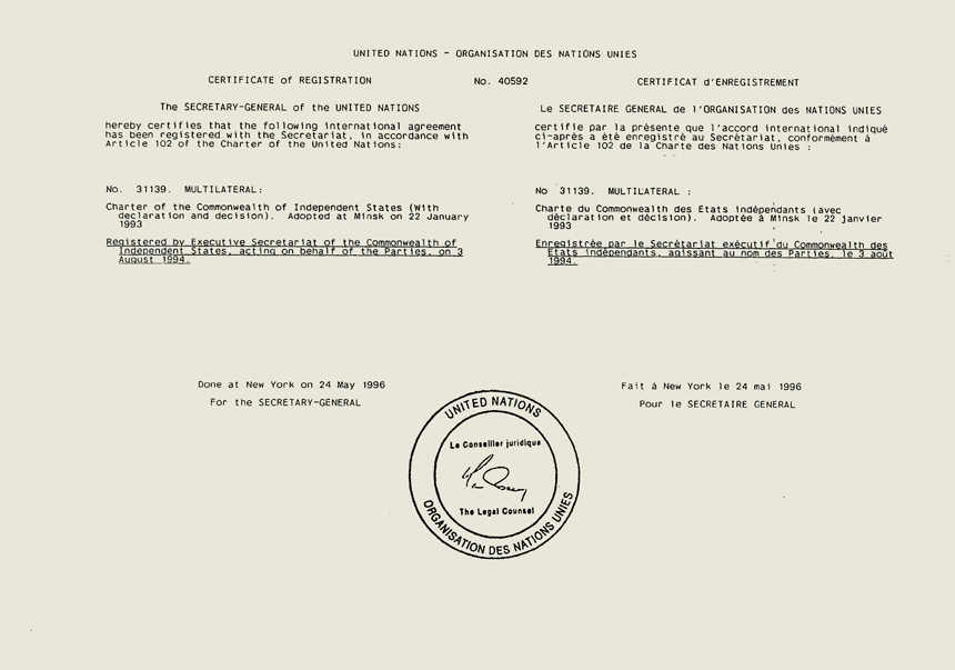 Свидетельство о регистрации Устава Содружества Независимых Государств в ООН